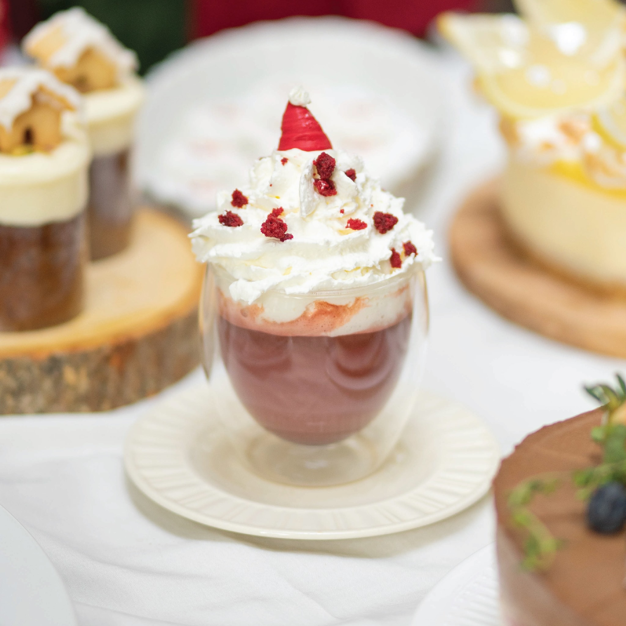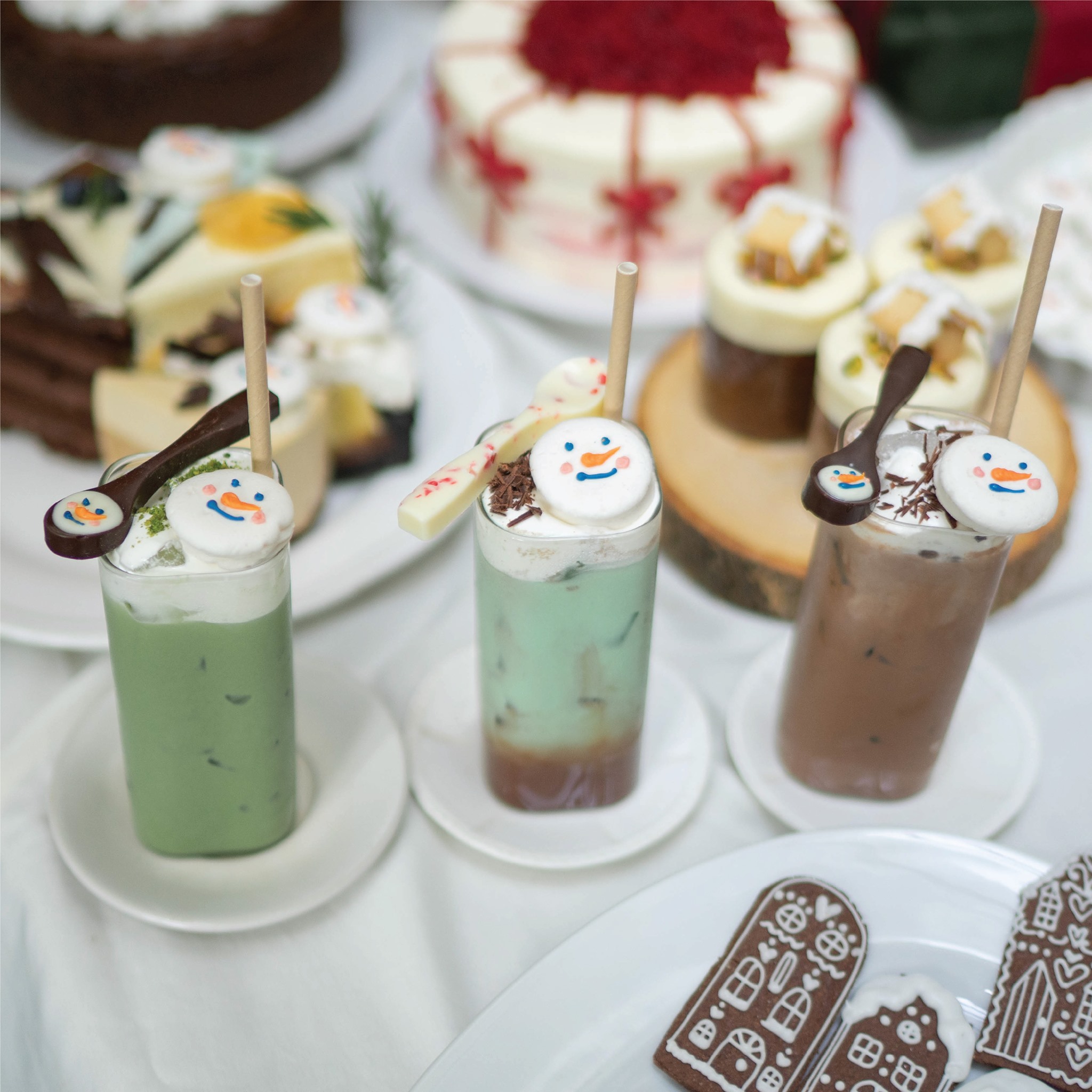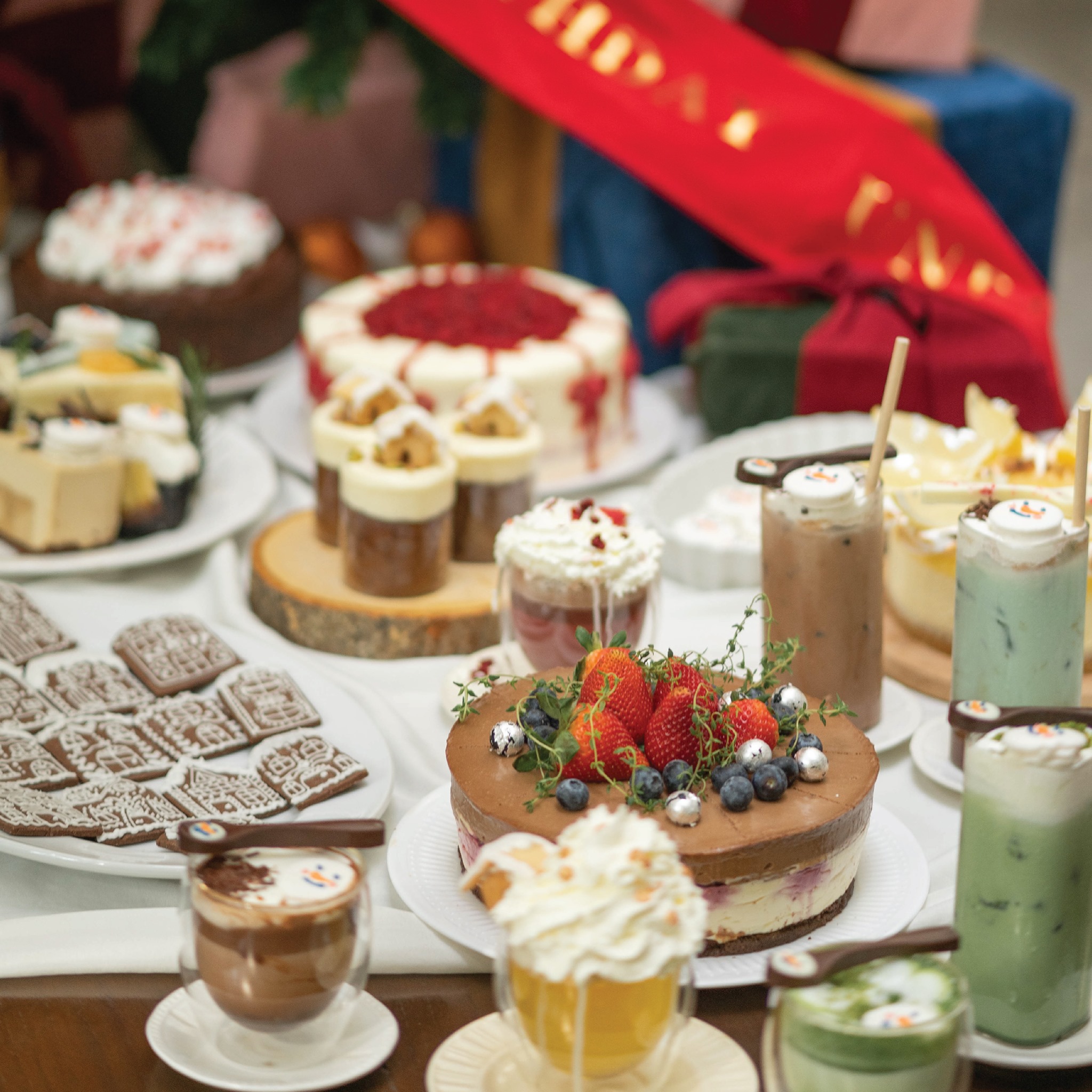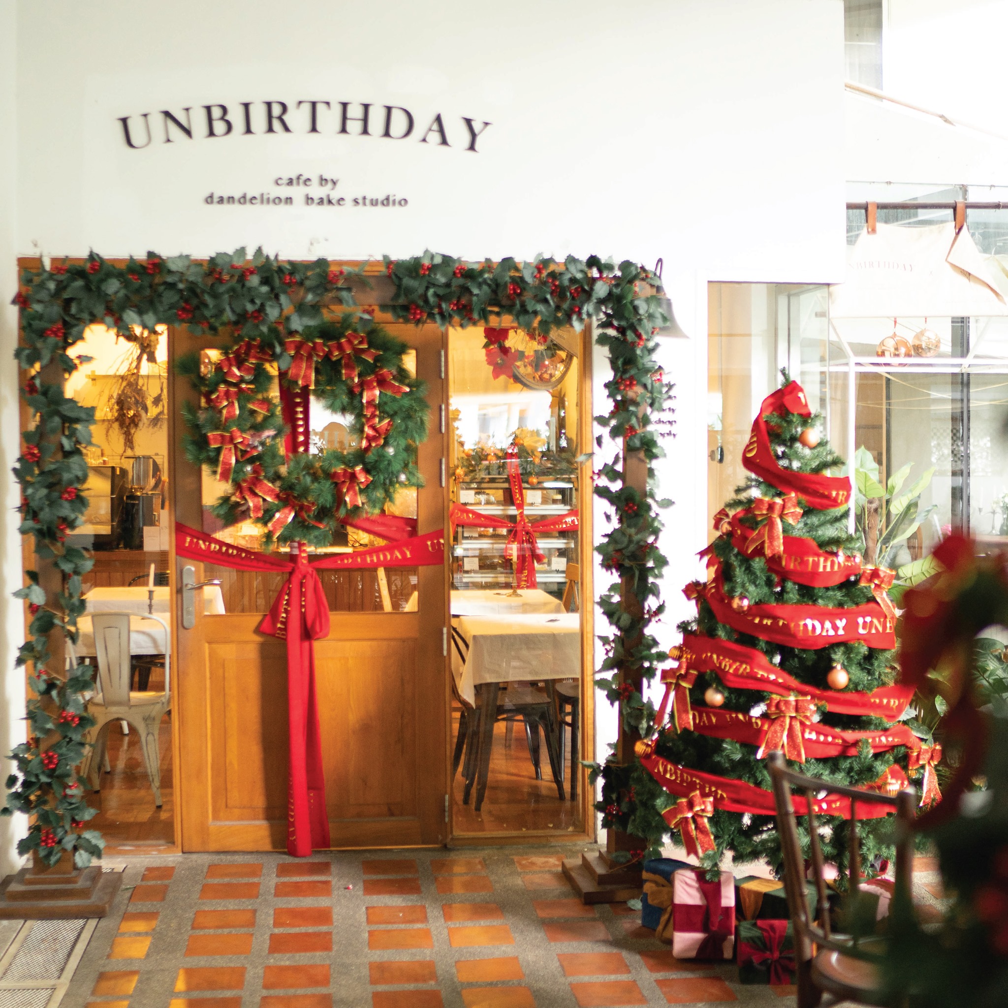 เริ่มกันที่คาเฟ่สีขาวสุดน่ารัก ที่ยิ่งพอตกแต่งธีมคริสมาสต์แล้วยิ่งน่ารักเข้าไปใหญ่ โดดเด่นด้วยต้นคริสมาสต์และกล่องของขวัญแสนน่ารักที่มาถึงก็พร้อมกดชัตเตอร์ถ่ายรูปได้ตั้งแต่หน้าร้านเลย กรอบประตูก็ตกแต่งได้ความ Festive สุดๆ ยังไม่ทันเข้าร้านก็รู้สึกมีถึงกลิ่นไอของความสุขแล้ว ไม่ใช่แค่ตัวร้าน แต่บรรดาเครื่องดื่มและขนมต่างๆก็ถูกบรรจงตกแต่งในรูปแบบของวันคริสมาสต์ ไม่ว่าจะเป็นน้อง Snowman หรือคุณลุง Santa ก็คือน่ารักไปหมดเลยยยย