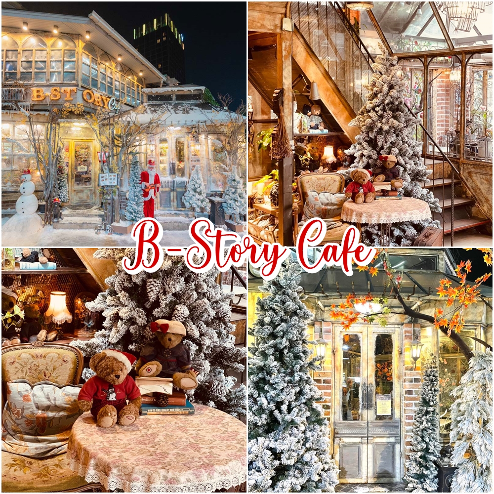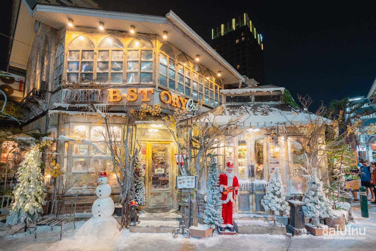ใครที่ผ่านไปผ่านมาแถว BTS ราชเทวี คงจะเคยเห็นคาเฟ่นี้อยู่บ่อยแน่ๆ เพราะดีไซน์เค้าโดดเด่นตกแต่งสวยงามตลอดเวลา เห็นกี่ทีก็อยากแวะมานั่งทุกที แล้วในช่วงเวลาแห่งเทศกาลแบบนี้ B-Story Cafe เค้าก็ไม่ยอมตกเทรนด์ จัดเต็มตกแต่งร้านในธีม Winter of Love เป็นบรรยากาศคริสมาสต์สไตล์วินเทจ ถึงแม้จะมีหิมะปกคลุมเหมือนอากาศติดลบ 10 องศาขนาดนี้ แต่ยังให้ความรู้สึกอบอุ่นได้อย่างลงตัว มีมุมสวยๆให้เลดี้ได้ไปถ่ายรูปกันจนเมมโมรีเต็มเลยล่ะค่ะ