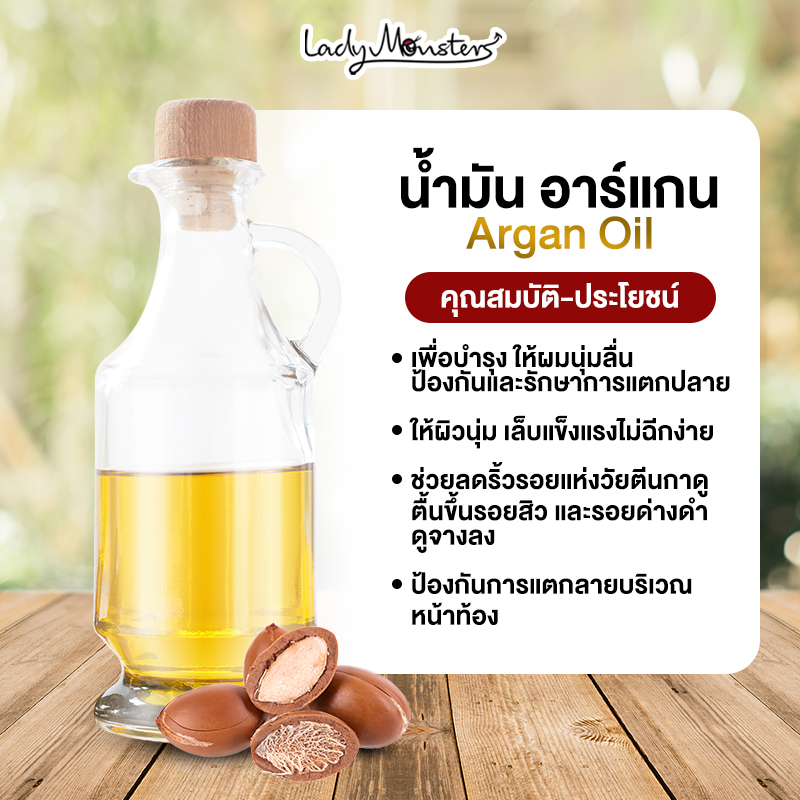 น้ำมันอาร์แกน หรือที่เราเรียกว่า อาร์แกนออยล์ (Argan Oil) เหมาะสำหรับทุกสภาพผิวเพราะอุดมไปด้วยวิตามินอี สารต้านอนุมูลอิสระ และกรดไขมันจำเป็น มีความบางเบา ไม่เหนียวเหนอะหนะ ช่วยในเรื่องต่อต้านริ้วรอยแห่งวัย ลดรอยแดงรอยดำให้ดูจางลงได้ น้ำมันอาร์แกนสามารถช่วยซ่อมแซมผิวให้ผิวชุ่มชื้น นุ่มน่าสัมผัส ช่วยบำรุงผมและเล็บให้แข็งแรงไม่เปราะหักง่าย