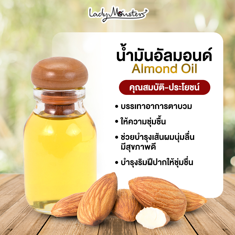 น้ำมันอัลมอนด์มีความอ่อนโยนสูง สามารถใช้ได้แม้แต่ผิวเด็ก ช่วยลดความกร้านของผิวเนียนนุ่มชุ่มชื้น เพราะมีวิตามินต่าง ๆ ไม่ว่าจะเป็นวิตามินเอ, บี, ดี และอี แถมยังมีสาร Anti-Oxidant ช่วยต่อต้านความชราของผิวได้ ส่วนใครที่ปลายผมแห้งเสีย ก็สามารถนำมาหมักก่อนสระ หรือบำรุงหลังสระก็ได้ค่ะ