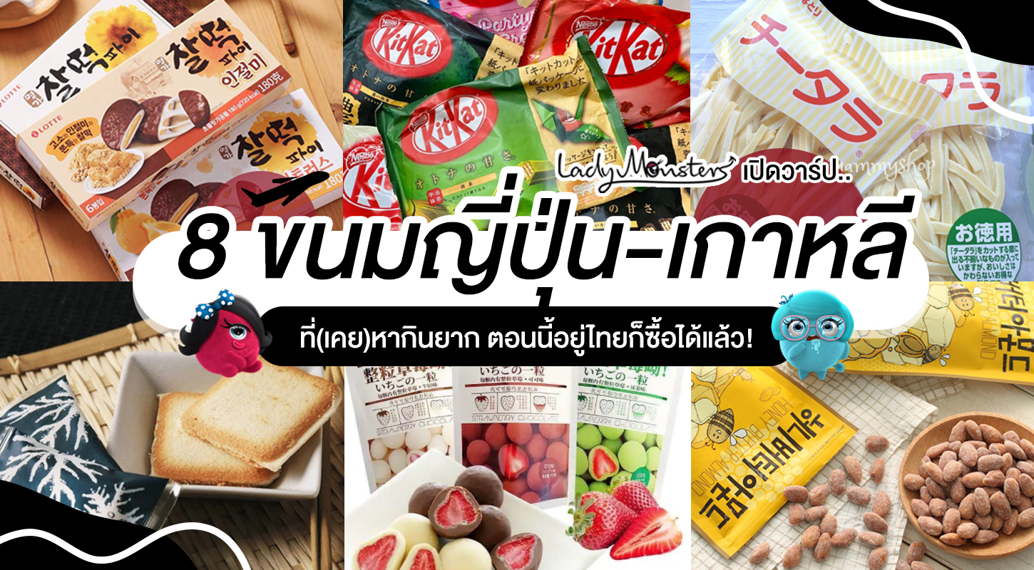 ไหนมีใครคิดถึงการเดินทาง คิดถึงทริปต่างประเทศกันบ้าง นอกจากบรรยากาศ สถานที่ท่องเที่ยวมากมายที่เราคิดถึงกันแล้ว เลดี้มอนสเตอร์เชื่อว่าต้องมีหลายๆคนคิดถึงของฝาก คิดถึงขนมอร่อยๆที่ญี่ปุ่นเอย เกาหลีเอยกันบ้างแน่ๆ ขนมหลายอย่างเมื่อก่อนกว่าจะได้กินคือต้องบินไปซื้อถึงที่ แต่เดี๋ยวนี้หลายๆอย่างก็มีขายที่ไทยแล้ว หรือบางอย่างที่ไม่มีก็พรีออเดอร์มากินได้แบบง่ายๆ วันนี้เลดี้มอนสเตอร์มาเปิดวาร์ป 8 ขนมญี่ปุ่น-เกาหลีให้แล้ว น่าจะพอให้หายคิดถึงไปได้บ้างน้า