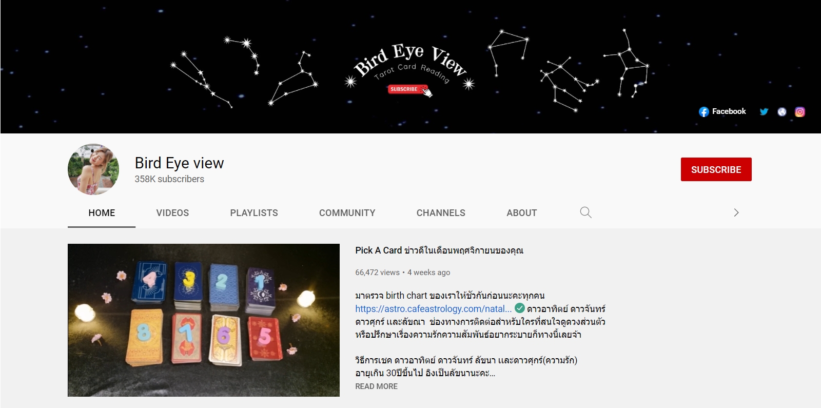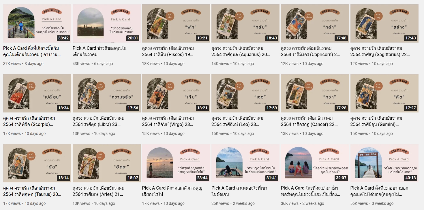 เริ่มกันที่ช่องดูดวงของหมอนก Bird Eye view ที่ดูดวงเรื่องความรักแม่นมากกก หลายคนพูดเป็นเสียงเดียวกันว่าแม่นจริง เหมือนเพื่อนสนิทเราแอบคาบข่าวไปบอกเลย โดยช่องนี้จะเน้นดูเรื่องความรักเป็นหลัก รักโสด มีคนคุย คนงงๆ คนมีแฟน มีหมด คอนเทนท์เยอะมาก เป็นการดูแบบเปิดไพ่ศาสตร์ตะวันตก และนอกจากดูดวงแล้วยังให้กำลังใจ ให้คำแนะนำที่ดีมากๆอีกด้วย