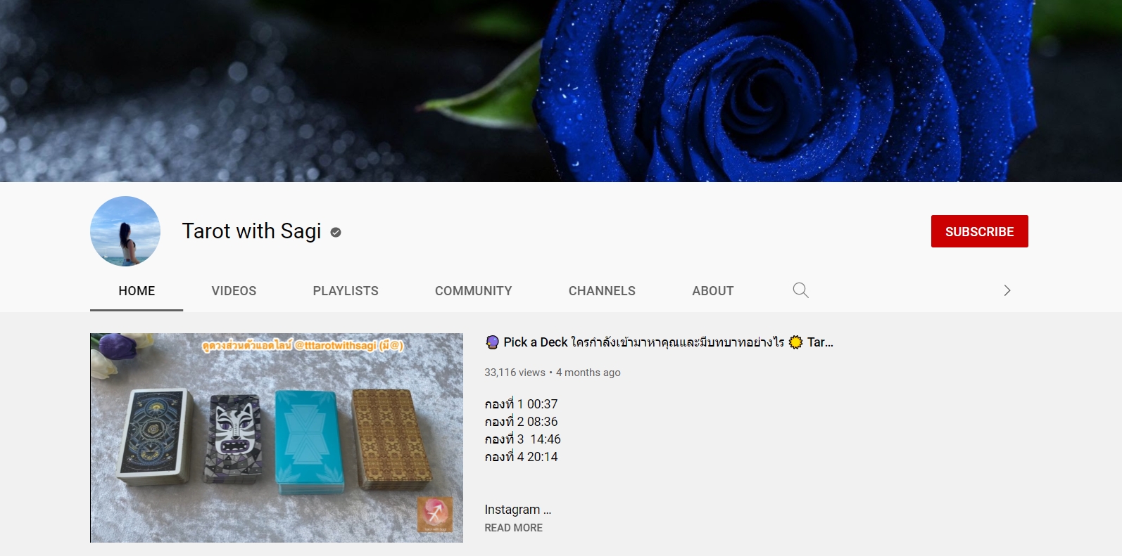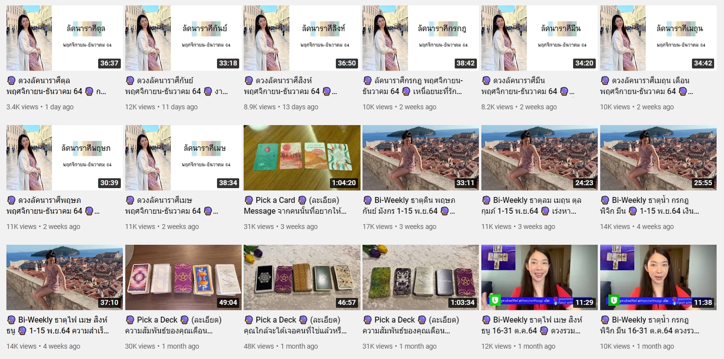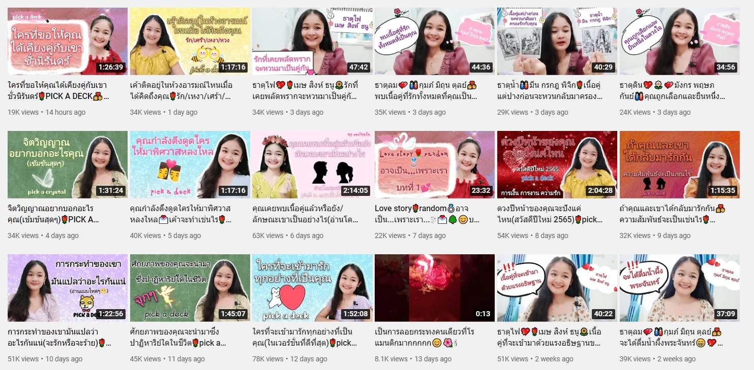 ปิดท้ายที่อีกหนึ่งช่องดูดวงด้านความรักที่โดดเด่นเรื่องความแม่นและคอนเทนท์หลากหลาย ช่องนี้เป็นการดูดวงไพ่ยิปซีแบบศาสตร์ตะวันตกตามธาตุทั้ง 4 มีทั้งทำนายรายเดือน รายปักษ์ และเปิดไพ่ทายใจตามหัวข้อต่างๆ